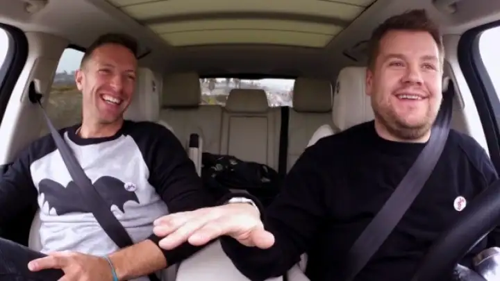 Durante o passeio, com destino ao Super Bowl, o cantor britânico se diverte ao lado do apresentador enquanto canta alguns dos maiores sucessos de sua banda, como "Yellow", "Viva La Vida" e "Paradise".