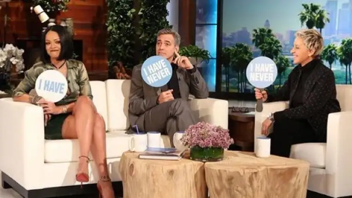 Rihanna participou do talk show de Ellen DeGeneres na tarde de ontem (3), e brincou de "Eu Nunca" ao lado do ator George Clooney antes de sua entrevista.